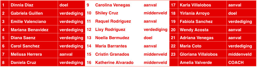 De Shirley Cruzzen van de toekomst moeten Melissa Herrera (18) en wonderkind Gloriana Villalobos (15!) worden. Herrera is spits en Villalobos middenveldster, het is nog niet duidelijk of zij al veel aan spelen zullen toekomen dit toernooi. Verder zijn de 21-jarige aanvalster Raquel Rodriguez en middenveldster Katherine Alvarado (24) dragende speelsters.